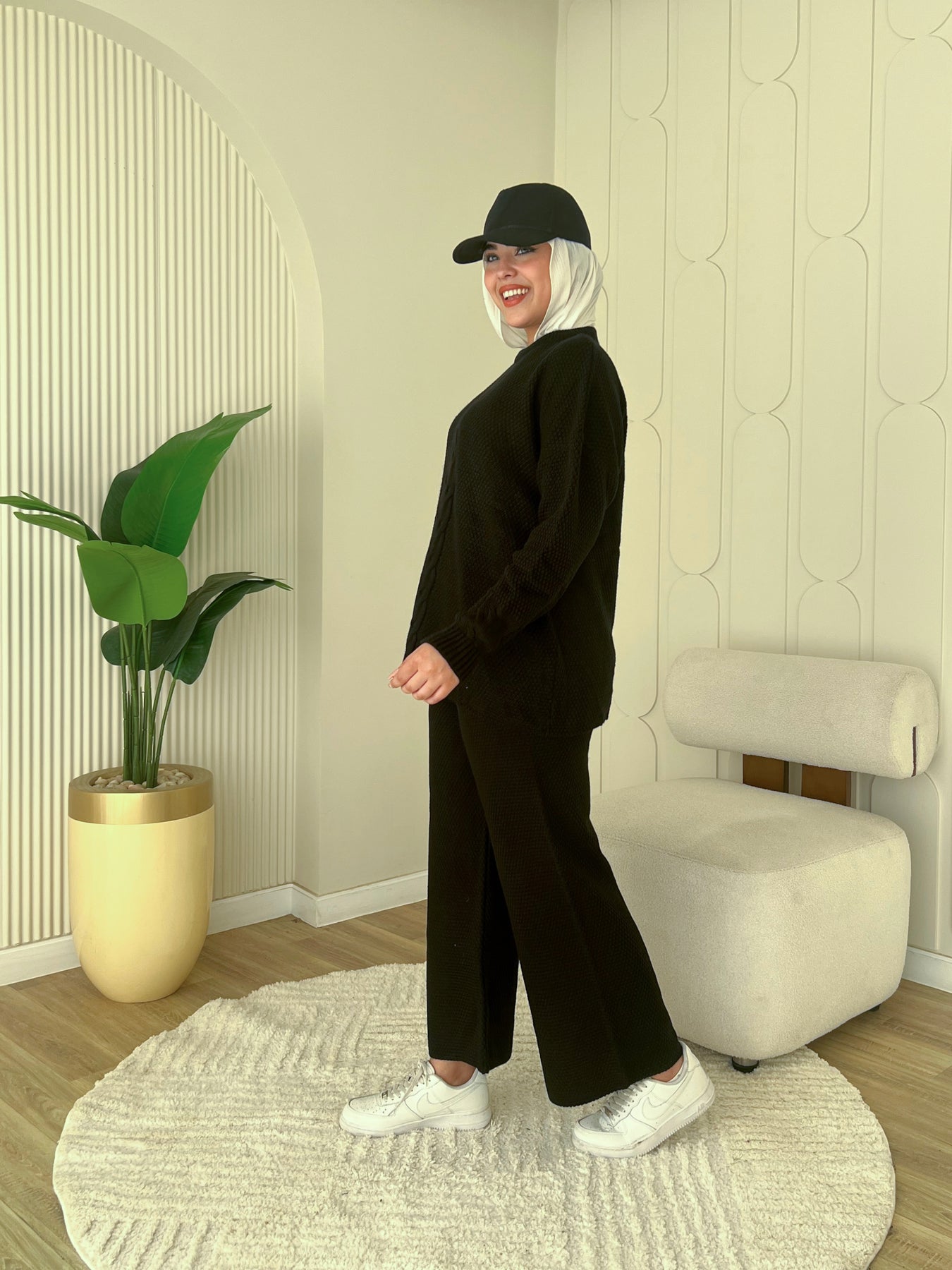 سوت تريكو أنيق مكون من قطعتين يمنحك إطلالة دافئة ومميزة في فصل الشتاء. مصنوع من خامة تريكو ناعمة ومريحة على البشرة، تجمع بين الدفء والأناقة في نفس الوقت