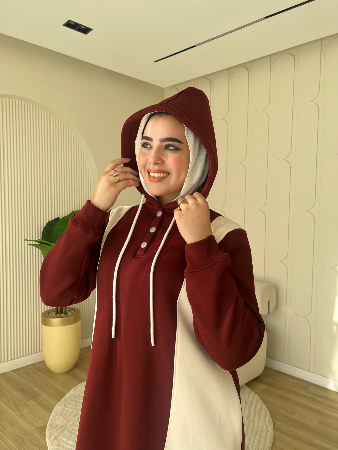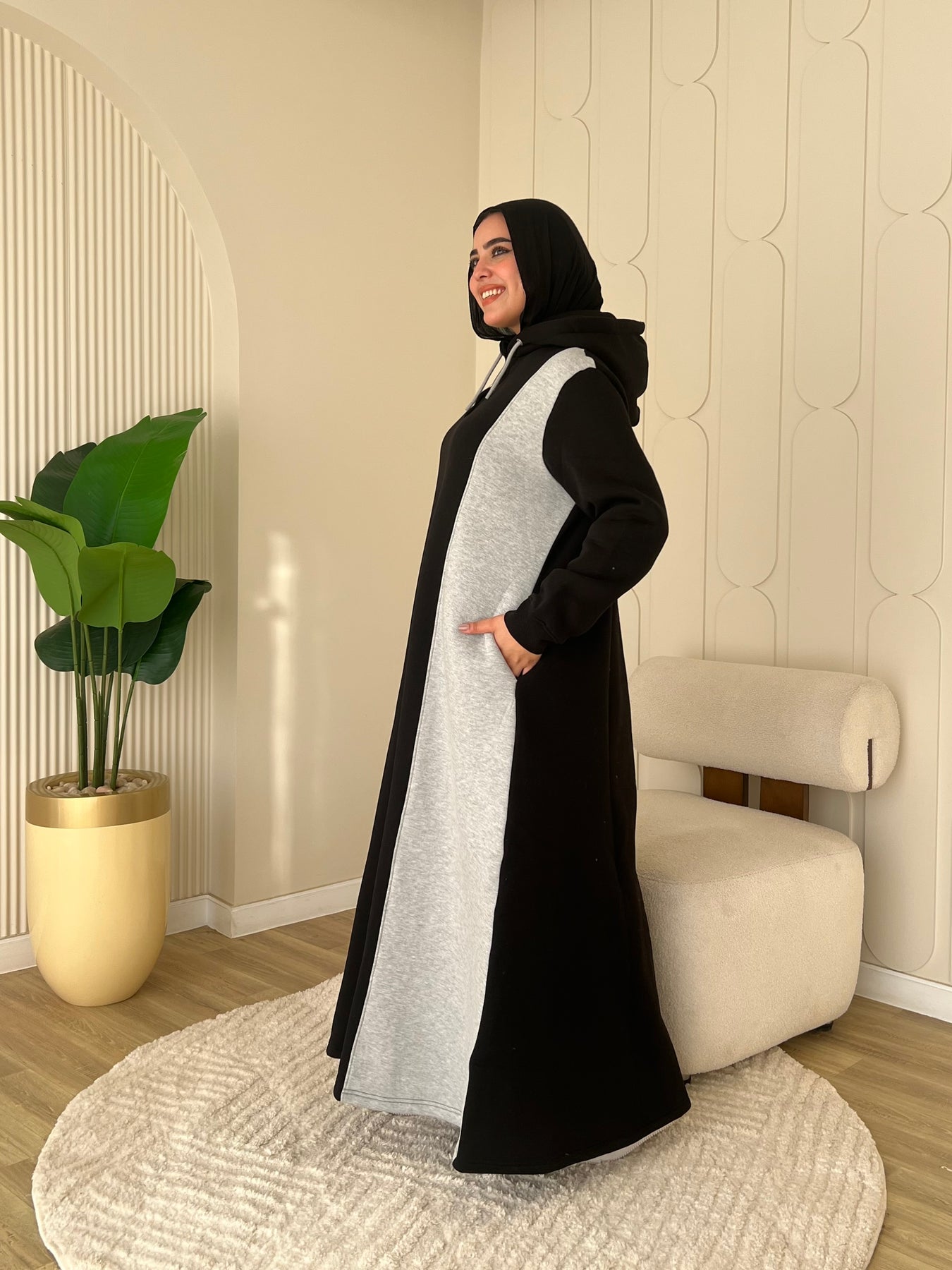 فستان شتوي أنيق بخامة ميلتون دافئة، بتصميم عصري يجمع بين لونين بشكل جذاب. مثالي للإطلالات اليومية في الأجواء الباردة مع لمسة مميزة من الأناقة.